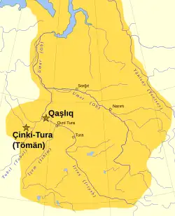 Jermak verließ Perm vermutlich im Sommer 1581 (laut Fisher[3] brach er im September 1579 auf und nahm Sibir im Oktober 1581 ein, laut Lincoln[4] brach Jermak am 1. September auf und eroberte drei Monate später Qaschliq). Er segelte den Tschussowaja hinunter und baute Winterquartiere in den Bergen und führte Angriffe gegen die einheimischen Mansen. Im Frühjahr überquerte er das Uralgebirge zum Fluss Barancha. Er baute Holzflöße, mit denen er diesen flussabwärts befuhr und die er später – als der Fluss tief genug war – zu Booten umwandelte. Auf dem Tura segelte er schließlich in Richtung Südosten und besiegte einen einheimischen Prinzen namens Epancha an dem Ort, an dem später Turinsk entstand. Die Tura weitersegelnd, eroberte er Tjumen. Am Fluss Tobol besiegten die Truppe eine einheimische Streitmacht, segelte weiter nordwärts und gewann später zwei weitere Schlachten, kurz bevor der Fluss Tawda in den Tobol mündet. Etwa 20 Meilen hinter der Tawda-Mündung schlugen sie eine weitere Schlacht und ergriffen Besitz von einem einheimischen Dorf, in dem sie eine einmonatige Pause eingelegt haben sollen.