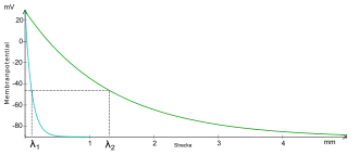 Zusätzlich zum Längswiderstand besitzt jedes Axon außerdem einen Membranwiderstand . Zusammen mit dem Längswiderstand errechnet sich daraus eine Membranlängskonstante . Sie gibt die Strecke entlang eines Axons an, nach der die Amplitude des Potentials auf 36,8 % abgefallen ist. Daraus lässt sich ableiten, dass die Strecke, nach welcher ein an einem Ort ausgelöstes Aktionspotential durch Öffnung spannungsabhängiger Kationenkanäle noch in der Lage ist, erneut ein Aktionspotential auszulösen, umso größer ist, je größer die Membranlängskonstante ist. Gemäß der obigen Gleichung lässt sie sich einerseits durch eine Steigerung des Membranwiderstandes erhöhen. Im menschlichen Organismus passiert dies durch eine Isolierung des Axons durch Myelinisierung, wodurch das Auftreten von Leckströmen reduziert, und so der Verlust der Ladungsträger, die für die Ausbildung der Potentialdifferenz verantwortlich sind, minimiert wird. Andererseits lässt sich die Membranlängskonstante durch eine Erniedrigung des Längswiderstandes erhöhen. Er verhält sich umgekehrt proportional zur Querschnittsfläche des Axons: eine Verdopplung des Axondurchmessers führt zu einer Abnahme des Längswiderstandes auf ein Viertel. Da jedoch, durch die dabei zunehmende Oberfläche des Axons, gleichzeitig die Membrankapazität zunimmt und der Membranwiderstand sinkt, fällt die Wirkung auf die Leitungsgeschwindigkeit in der Praxis geringer aus.