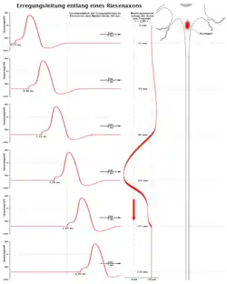 Bei Wirbeltieren (Vertebraten) sind die meisten Axone von einer Myelinscheide umhüllt (markhaltige Nervenfaser), die von Schwannschen Zellen im peripheren Nervensystem oder von Oligodendrozyten im Zentralnervensystem gebildet wird und die im Abstand von 0,2 mm bis 1,5 mm unterbrochen ist. Man nennt eine solche Unterbrechung Nodus, Knoten oder Ranvierscher Schnürring. Den myelinisierten, d. h. isolierten Abschnitt, nennt man Internodium.[2] Durch diese Isolation vergrößert sich die Membranlängskonstante (siehe oben) des Axons von wenigen Hundertstelmillimeter auf einige Millimeter. Da die Isolation auch zu einer Verringerung der elektrischen Kapazität von rund 300 nF/m auf etwa 0,8 nF/m führt, verringert sich außerdem die Membranzeitkonstante.[3] Allein durch diesen Effekt sind reale Fortleitungsgeschwindigkeiten von über 100 m/s bei unverändertem Querschnitt des Axons möglich. Zudem befinden sich spannungsabhängige Na+-Kanäle sowie Na+/K+-ATPasen in 100-fach höherer Dichte an den Schnürringen. All diese Komponenten ermöglichen, dass ein Aktionspotential, das an einem bis zu 1,5 mm entfernten Schnürring generiert wurde, die Membran am nächsten Schnürring genügend depolarisiert, um dort ein weiteres Aktionspotential auszulösen. Die genauen elektrophysiologischen Vorgänge, die dabei stattfinden, sind im Folgenden beispielhaft beschrieben: