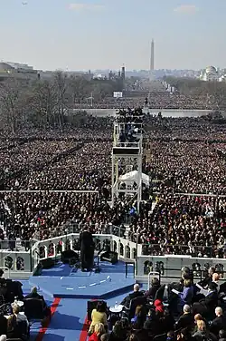 Die Vereidigung fand auf einem Podium an der Westseite des Capitols statt. Zunächst nahm der Richter am Obersten Gerichtshof John Paul Stevens den Amtseid von Vizepräsident Joe Biden ab. Dann nahm Chief Justice John Roberts in Gegenwart von Michelle Obama und der beiden Töchter Obamas Amtseid als Präsident ab. Barack Obama legte den Amtseid auf der Bibel ab, die Abraham Lincoln 1861 bei seiner Amtseinführung schon genutzt hatte.[6] Obama wurde wegen Verzögerungen erst kurz nach zwölf Uhr mittags vereidigt. Es folgte seine zwanzigminütige Amtsantrittsrede.[2]