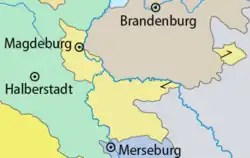 Im Westfälischen Frieden von 1648 wurde das Territorium des Erzstifts Magdeburg, also der weltliche Besitz des Erzbischofs von Magdeburg, als erbliches Herzogtum Magdeburg dem Kurfürstentum Brandenburg zugesprochen. Diese Bestimmung trat nach dem Tode des letzten Administrators Herzog August von Sachsen-Weißenfels im Jahr 1680 in Kraft. Das 1994 gegründete Bistum Magdeburg sieht sich in der Tradition des früheren Erzbistums.[2]