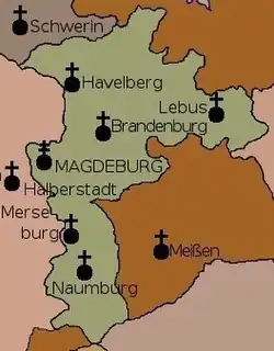 Das Erzbistum Magdeburg wurde aus Gebieten der Diözese Halberstadt geschaffen. Schutzpatron des Erzbistums war der heilige Mauritius. Als Suffragane wurden dem Metropoliten die Nachbarbistümer Brandenburg, Havelberg, Zeitz, Merseburg und Meißen unterstellt.[2] Erster Erzbischof von Magdeburg wurde 968 der Russenmissionar und Abt von Weißenburg, Adalbert. Neben seiner Stellung als Metropolit einer großen Kirchenprovinz war der Erzbischof auch Primas Germaniae. Von seiner Bedeutung im Hochmittelalter zeugt der mächtige Magdeburger Dom.
