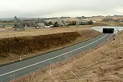Trasse der Autobahn D8 auf dem Kamm des Osterzgebirges mit dem Špičák u Krásného Lesa im Hintergrund -