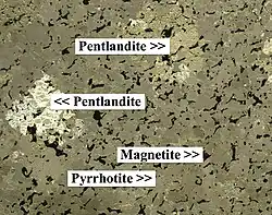 In anderen Fällen kann es zur Trennung bestimmter unmischbarer Komponenten (Phasen) in der Schmelze kommen, so wie sich Wasser von Öl trennt (Liquidentmischung). In Sulfid-Silikat-Schmelzen scheiden sich z. B. Sulfidtröpfchen ab. In diesen Tröpfchen konzentrieren sich besonders Kupfer und Nickel, ebenso Metalle der Platin-Gruppe. Wenn sich die einzelnen Tröpfchen miteinander vereinen, können so umfangreiche Sulfid-Lagerstätten entstehen, wie z. B. in Greater Sudbury (Kanada).
