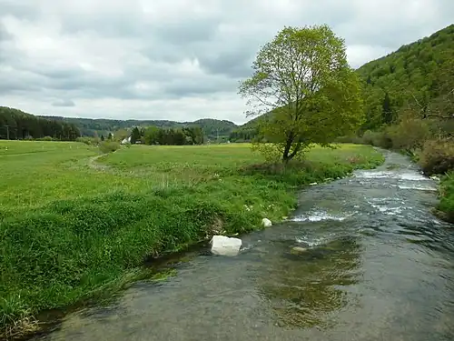 ![]() NSG Eselmühle: Rechts die Schmiecha und links im Hintergrund die Gebäude der Eselmühle. | ||