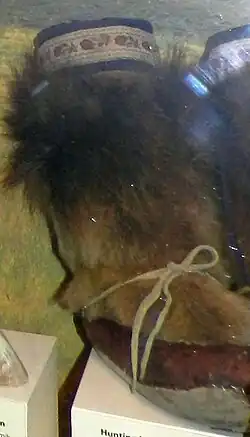 Weitere Materialien sind je nach Vorkommen: Elchhäute, Belugawal-Häute, Wolfsfelle, Vielfraßfelle, Bisamfelle, Felle des arktischen Erdhörnchens, Polarfuchsfelle und Rotfuchsfelle.[2] Zur Verzierung werden Perlen und Stachelschweinborsten verwendet.[4]