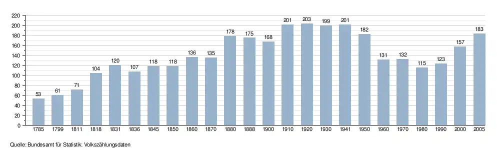 - ↑ Daten der Eidgenössischen Volkszählungen ab 1850 nach Gemeinden. (XLSX; 10 MB) Bundesamt für Statistik, Neuchâtel, 12. Juli 2024, abgerufen am 18. September 2025 (Öffnung in Excel nur über "Anhang/Excel-Datensatz" möglich).