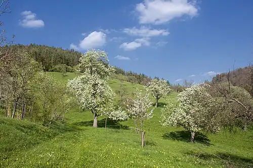 Die extensive Bewirtschaftung der Kulturlandschaft mit ihren ungedüngten Mähwiesen, Schafweiden und Obstbaumwiesen führte zu typischen Pflanzengesellschaften wie Salbei-Glatthaferwiesen, Halbtrockenrasen, Saumgesellschaften und Streuobstbeständen, allesamt miteinander verzahnt oder Mosaikartig verschachtelt. Dazwischen befinden sich einzelne kleine Hackfrucht-Äcker und teilweise brachgefallene Parzellen. Auf den Magerrasen wachsen Brand-Knabenkraut, Helm-Knabenkraut und Kleines Knabenkraut gemeinsam mit Fransenenzian und Kugelblume. Gefiederte Bewohner der Streuobstwiesen sind Grünspecht, Buntspecht und Wendehals, unter den Bodenbrütern sind Feldschwirl und Baumpieper anzutreffen und in den Hecken brütet der Neuntöter.[2]
