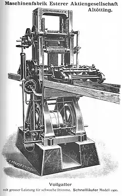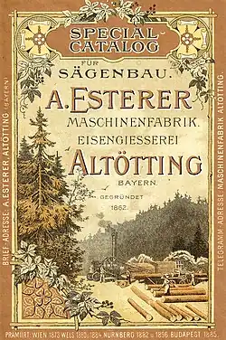 1880 investierte Esterer in ein Elektrizitätswerk, zunächst um das Unternehmen und ab 1894 auch die Stadt Altötting mit Strom zu versorgen. Im Jahre 1900 hatte das Unternehmen bereits 290 Mitarbeiter. Um den Kapitalbedarf zu decken, wurde in diesem Jahr das Unternehmen in eine Aktiengesellschaft mit einem Kapital von 1 Mio. RM umgewandelt.[5] In der Folgezeit konzentrierte sich das Unternehmen auf den Bau von Dampflokomobilen, Dampfmaschinen für den landwirtschaftlichen Einsatz, Dreschmaschinen und nach dem Zweiten Weltkrieg mit einer breiten Palette an Maschinen für die Landwirtschaft vom Dungstreuer bis zur Erntemaschine. Zum Unternehmen gehörte auch weiterhin das Elektrizitätswerk. Von Anfang an war auch der Bau von Sägegattern und Sägewerksanlagen ein wichtiger Geschäftszweig. Die Esterer AG stellte auch Sägemaschinen für Steine, insbesondere von Marmorblöcken her.