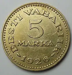 Mit der Währungsreform am 1. Januar 1928 waren 100 Mark = 1 Estnische Krone. Die neue Währung wurde an die Schwedische Krone gebunden und entsprach 0,4032 Gramm Gold.