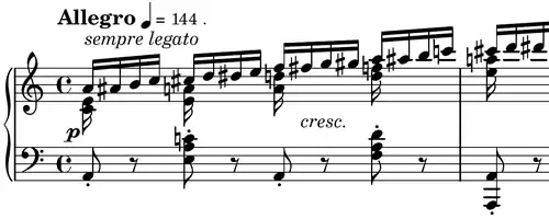 = 114 vor.[6] Als Vortragsanweisung gibt der Komponist ein sempre legato (immer gebunden) für die rechte Hand vor und erinnert den Spieler in der Notation noch sechsmal daran. Dieses für die Fingerübung wichtige Legato steht im starken Gegensatz zum Staccato der begleitenden Akkorde der linken Hand.