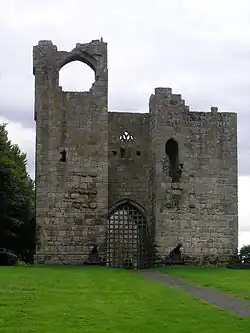 Das Torhaus in der Südostecke hat eine Grundfläche von 11 × 11 Meter, und sein gewölbter Durchgang war ursprünglich durch ein Fallgatter, ein Tor und eine Zugbrücke gesichert.[32] Auf beiden Seiten des Durchgangs waren gewölbte Wachräume, 6,4 Meter lang und bis zu 2 Meter breit.[24] Im ersten Obergeschoss, das heute nicht mehr existiert, gab es eine große Kammer mit 6,7 Meter × 5,8 Meter Grundfläche und einem 2,29 Meter × 2,29 Meter großen Vorraum. Ein Durchgang führte zu einer Art Vorbau oder Plattform.[33] Das Torhaus war, was der Architekturhistoriker ‘’Anthony Emery’’ als “flammende Fensterzeichnung” beschrieb, das Wappen der Manners ist über dem Eingang zum Torhaus eingemeißelt.[4][33]