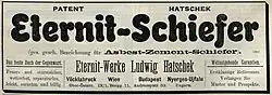 Anfang des 20. Jahrhunderts wurde Eternit als das „beste Dach der Gegenwart“ beworben, das „feuer- und sturmsicher, wetterfest, reparaturlos, leicht, vornehm und billig“ sei.[1]