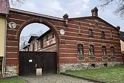 Nach einer am Gebäude befindlichen Datierung entstand der zweigeschossige, aus Ziegelsteinen auf einem Sockel aus Bruchsteinen errichtete Bau im Jahr 1904. Die Fassade des giebelständig zur Straße angeordneten Hauses ist mit Ziegeln in unterschiedlichen Farben auffällig gegliedert. Im Giebel befinden sich zwei Medaillons, die verschlungene Monogramme darstellen. Östlich schließt sich ein in gleicher Weise wie die Fassade gestalteter Torbogen. In den Zwickeln des Torbogens befindet sich jeweils ein Stuckmedaillon mit Darstellungen von Fortuna und Demeter.