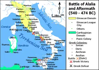 Karte der ungefähren Machtbereiche karthagischer und etruskischer Gebiete sowie der der Griechen während und nach der Schlacht von Alalia,[1] welche die Griechen verloren. Obwohl die Etrusker, teils im Verein mit den Karthagern, immer wieder mit den griechischen Kolonien aneinandergerieten, übernahmen sie doch weite Teile ihrer Religion und Kultur.