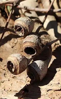 Die Frucht ist bei einer Länge von 10 bis 17 mm lang und einem Durchmesser von 9 bis 16 mm zylindrisch, ei- oder glockenförmig. Der Diskus ist eingedrückt, die Fruchtfächer sind eingeschlossen oder auf dem Niveau des Randes.[2]