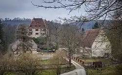 1897 erwarb Nübling das Gelände mit den Ruinen von Burg und Schloss Neusteußlingen oberhalb Talsteußlingen im Schmiechtal. Er ließ die immer noch beachtlichen Baureste[1] abbrechen und errichtete auf der Burg- und Schlossstelle ein schlossähnliches Landgut in historistischem Stil, unter Verwendung der beim Abbruch angefallenen Baumaterialien (Kalksteine)[2]. Der Grundriss der neuen Gebäude im Vergleich zu den Vorgängerbauten wird bei Schmitt[3] wiedergegeben. Nübling betrieb auch die nahegelegene Genossenschaftsmühle Talsteußlingen.