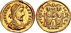 Arbogast und Eugenius bemühten sich bis 393 um die Anerkennung durch den senior Augustus Theodosius I., prägten Münzen mit seinem Abbild und setzten Inschriften im Namen von Eugenius, Theodosius und Arcadius.[19] Theodosius zeigte sich jedoch unbeeindruckt: Er erhob seinen jüngeren Sohn Honorius demonstrativ zum Mitkaiser für den Westen und trat der Usurpation nach längerer Vorbereitung schließlich auch militärisch entgegen, indem er in Italien einmarschierte und Eugenius’ Armee in der äußerst blutigen Schlacht am Frigidus (im heutigen Slowenien) am 5./6. September 394 schlug. Das von mehreren, vor allem christlichen Quellen vermittelte Bild eines regelrechten Religionskampfes ist subjektiv gefärbt; auf beiden Seiten kämpften am Frigidus Christen und Heiden.[20] Allerdings kann letztlich nicht ausgeschlossen werden, dass nach einem Sieg des Eugenius der Druck des „harten Kerns“ der Heiden um Nicomachus Flavianus auf Eugenius zugenommen und sich die Situation für die Christen möglicherweise verschlechtert hätte. Doch dazu kam es nicht: Arbogast und der ältere Nicomachus Flavianus begingen unmittelbar nach dieser entscheidenden Niederlage Suizid, während Eugenius von feindlichen Soldaten ergriffen und erschlagen wurde. Theodosius wurde, wenngleich nur für kurze Zeit, der letzte Herrscher des Gesamtreiches.