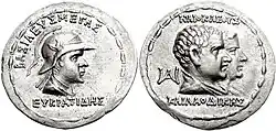 Die genaue Herkunft des Herrschers ist umstritten, wie überhaupt viele Einzelheiten der Geschichte des griechisch-baktrischen Reiches. Einige Münzen zeigen vielleicht die Eltern Eukratides’ I. Sein Vater war ein gewisser Heliokles, seine Mutter eine gewisse Laodike, die vielleicht mit dem Königshaus der Seleukiden verwandt war,[4] da der Name Laodike in diesem Haus sehr beliebt war. Der Name ist jedoch auch woanders bezeugt, so dass diese Verbindung nicht zwingend ist.[5] Eukratides I. scheint jedenfalls nicht mit der Dynastie des Euthydemos I. verwandt gewesen zu sein, die vorher in Baktrien regierte.
