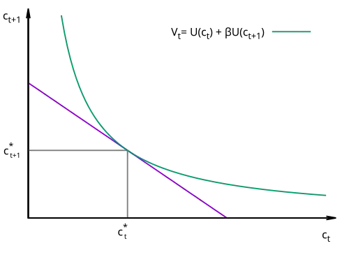 unter der Annahme eines positiven, aber abnehmenden Grenznutzens (). Außerdem gibt es einen Diskontfaktor . Der Diskontfaktor spiegelt eine positive Zeitpräferenz wider, d. h. der Konsum zu späteren Zeitpunkten soll den Individuen weniger wertvoll erscheinen als der Konsum in der aktuellen Periode. Des Weiteren soll folgende Budgetrestriktion eingehalten werden: