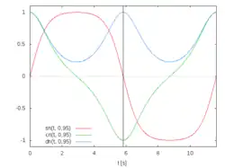 Die Funktionen sn und cn sind periodisch mit der Periode 4K und dn mit der Periode 2K, siehe Abb. 8, wo K das vollständige elliptische Integral erster Art ist: