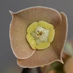Der Blütenstand besteht aus wenigen Cymen, die 2- bis 3-fach gegabelt sind und auf langen Blütenstandstielen stehen. Die gerundeten und nickenden Cyathophyllen werden 3 Millimeter lang und 5 Millimeter breit und sind hell rostgelb gefärbt. Das Cyathium wird 5 Millimeter groß. Die Nektardrüsen sind gelb und der sitzende Fruchtknoten ist stumpf gelappt.