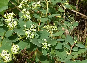 Der Blütenstand besteht aus sehr dicht stehenden Cymen, die sich an den Triebspitzen bilden. Die Cyathien werden 2 Millimeter groß und die Nektardrüsen besitzen am Rand sehr kleine kronblattartige Fortsätze. Die stumpf gelappte Frucht ist nicht behaart und der kugelförmige Samen ist glatt.