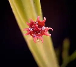 Der Blütenstand wird durch einfache und nahezu sitzende Cymen gebildet. Die dunkelroten Cyathien werden bis 12 Millimeter groß. Es werden 5 bis 7 Nektardrüsen ausgebildet, an denen jeweils 2 Hörner stehen. Diese sind etwa 2 Millimeter lang und einwärts gebogen. Die stumpf gelappte Frucht ist rot gefärbt und wird bis 4 Millimeter groß. Sie steht an einem herausragenden und zurückgebogenen Stiel. Der eiförmige Samen besitzt ein Anhängsel.