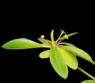 An den Spitzen der Triebe stehen die eingeschlechtlichen Cyathien in Büscheln. Die Blütenstandstiele sind 3 Millimeter lang und die Cyathien erreichen einen Durchmesser von 3 Millimeter. Die elliptischen Nektardrüsen sind grün gefärbt und stoßen aneinander. Die stumpf gelappte Frucht wird etwa 7 Millimeter groß und ist nahezu sitzend. Der kugelförmige Samen ist 2 Millimeter groß.