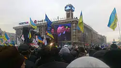 Als am 29. November bekannt wurde, dass das Assoziierungsabkommen nicht unterzeichnet worden war, strömten wieder zehntausende Menschen zum Majdan Nesaleschnosti. Auch in Lwiw gab es eine große Demonstration mit 20.000 Teilnehmern.[81][82][83] Einige in der Ukraine beliebte Sänger, wie Swjatoslaw Wakartschuk mit Okean Elsy und Ruslana Lyschytschko, sowie viele Oppositionelle, darunter Arsenij Jazenjuk, Vitali Klitschko (UDAR) sowie Oleh Tjahnybok (Allukrainische Vereinigung „Swoboda“), riefen auf dem Maidan zu einer friedlichen Revolution auf und forderten den Rücktritt Janukowytschs.[80][84] In Lwiw wurde eine Menschenkette zur Grenze mit der Europäischen Union gebildet, die nach Aussagen der Organisatoren sogar über die polnische Grenze hinausreichte.[83]