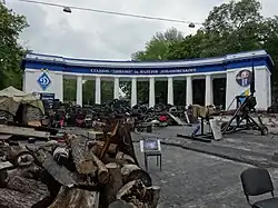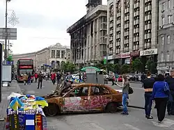 Seit dem 18. Februar 2014 kam es am Unabhängigkeitsplatz in Kiew erneut zu schweren Zusammenstößen zwischen Polizei und Regierungsgegnern. Dabei kamen nach offiziellen Angaben zunächst mindestens 28 Menschen ums Leben, die Zahl der Verletzten auf beiden Seiten wurde auf mehrere hundert Personen geschätzt.[173] Die Polizei setzte dabei unter anderen scharfe Waffen, Molotowcocktails sowie Splittergranaten ein und arbeitete Hand in Hand mit Tituschkis.[174] Beide Konfliktparteien wiesen sich gegenseitig die Verantwortung für die Eskalation zu. Regierungsgegner besetzten das zwei Tage zuvor geräumte Rathaus erneut, um es als Lazarett zu nutzen.[175][176][177] Das Haus der Gewerkschaften brannte fast vollständig aus.[178][179] Auch in anderen Städten der Ukraine, vor allem im Westen des Landes, kam es zu Ausschreitungen, unter anderem in Lwiw, Iwano-Frankiwsk und Riwne.[180] Vertreter lokaler Polizeikräfte in Städten der West- und Zentralukraine wechselten die Seite.[181]
