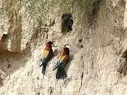 Der Bienenfresser ist ein Koloniebrüter. Das Nest wird als Bruthöhle in Hänge und Wände von Steilufern oder Sandgruben gegraben,[2] wobei die Brutpaare diese ziemlich nah beieinander anlegen. Besonders am Rande des Verbreitungsgebietes sind allerdings auch einzelne Brutpaare beobachtet worden. Solche Pionieransiedlungen verschwinden entweder bald oder vergrößern sich rasch zu Brutkolonien.