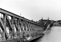 Französische Pioniereinheiten errichteten ab dem 19. April 1945 zuerst eine Pontonbrücke,[3] die am 7. Oktober 1946 durch die wiederaufgebaute Holzbrücke ersetzt wurde. Aber schon nach drei Jahren wies die Holzbrücke schwere Schäden auf, da frisches Holz ohne weitere Schutzmaßnahmen verwendet worden war. Dies machte den Bau einer neuen Brücke erforderlich.