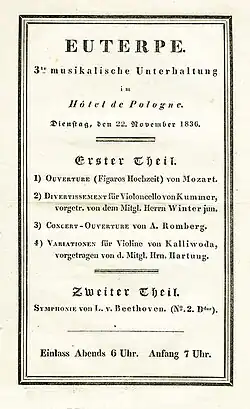 Auf Karl August Reichardt folgte von 1831 bis 1838 als Musikdirektor Christian Gottlieb Müller (1800–1863). Unter ihm entwickelte sich die Euterpe zu einem für die Gewandhaus-Konzertdirektion ernstzunehmenden Konkurrenten. Ab der Saison 1835/1836 wurden zwölf Konzerte gespielt. Es gab hauptsächlich Abonnements, aber auch Einzelkarten waren erhältlich. In den Programmen kam es vor, dass Euterpe dem Gewandhaus Leipziger Premieren von großen Instrumentalwerken vorwegnahm. Eine Reaktion des Gewandhauses war 1835 das Engagement von Felix Mendelssohn Bartholdy (1809–1847) als Gewandhauskapellmeister. Es gab auch Versuche des Gewandhauses, der Euterpe durch Verbote zu schaden, etwa Gewandhausmusikern zu verbieten, bei Euterpe mitzuwirken. Diese schlugen fehl.[2] Die Spannungen glätteten sich, als 1838 Johannes Verhulst (1816–1891), der Kontakte zu Mendelssohn Bartholdy pflegte, Musikdirektor der Euterpe wurde. Nach dessen Weggang 1842 wechselten die Musikdirektoren häufig, aber Euterpe blieb neben dem Gewandhaus ein wesentlicher Faktor des Leipziger Musiklebens.