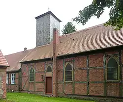 Das Gotteshaus ist eine rechteckige, neugotische Saalkirche auf einem Feldsteinsockel und besteht hauptsächlich aus Fachwerk mit unverputzter Ziegelausfachung, ein Teil ist auch massiv konstruiert. Über dem Satteldach erhebt sich im Osten ein verbretterter Glockenturm.[3] Er hat eine quadratische Grundform und besitzt ein flaches, pyramidenförmiges Dach.[3] Auf circa 1900 datiert die mehrfarbige Bleiverglasung der Fenster.[1] Die Kirche verfügt von außen über zwei Zugänge. Während das Hauptportal auf der Westseite liegt, lässt sich die Kirche auch durch eine Tür an der nördlichen Längsseite betreten.[3] Die Kirche zeigt nur eine ungenaue Ostung und ist eher von Südwest nach Nordost ausgerichtet.[3]