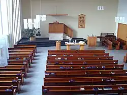Die spitze Decke wird durch mehrere fünfeckige Betonpfeiler getragen und ist hölzern vertäfelt. Der Innenraum ist entsprechend reformierter Tradition schlicht gestaltet und weist kein Kreuz auf. Es überwiegen holzsichtige Farben. An der Südwestseite ist eine Empore eingezogen, auf der die Orgel angebracht ist. Die hölzerne Kanzel mit trapezförmigem Schalldeckel ruht auf einem hellen, steinernen Sockel. Sie ist nicht mittig, sondern entsprechend dem Goldenen Schnitt an der Nordostwand angebracht. Der Kanzelbereich ist um drei Stufen aus dunklem Stein erhöht. Rechts davon stehen ein Lesepult aus Holz und Bänke, vor der Kanzel ein Taufbecken und ein Tisch. Das Gestühl, das zwei Durchgänge freilässt, ist mahagonifarben gefasst.