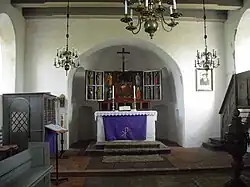 Die Apsis lässt drei kleine Fenster erkennen, von denen allerdings zwei, das nördliche und das südliche, zugemauert sind. Sie besitzt ein eigenes, ihrer Rundform entsprechendes polygones Dachwerk, das sich an den Giebel der Saalkirche anlehnt.
