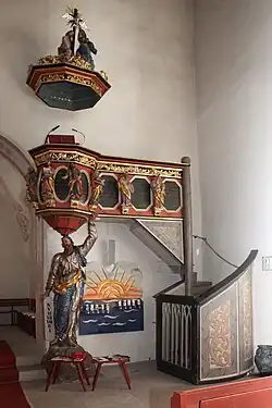 An den Längsseiten des Kirchenschiffes stehen dreistöckige hölzerne, farbig gefasste Emporen mit vertäfelten Brüstungen, an der Schmalseite eine zweistöckige Empore mit der Orgel. An der Brüstung der Orgelempore ist ein Ölgemälde der Himmelfahrt Jesu, genau darunter an der untersten Empore ein Ölgemälde, Aaron mit dem Weihrauchgefäß im Allerheiligsten des Tempels.