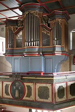 Ein Orgelbau ist für den Zeitraum von 1673 bis 1684 belegt. Die Orgel wurde wohl 1706 in das neue Kirchenschiff übernommen. 1794 baute der Coburger Orgelbauer Johann Caspar Haueisen für 180 Reichstaler das Instrument um. Den nächsten Umbau mit der Erneuerung von zwei Registern führte 1925 der Coburger Karl Graßmuck durch. Die Orgel hatte damals 16 Register, ein Manual, ein Positiv und Pedal.[5] 1969 wurde ein Werk ausgebaut und 1971 wurde die Orgel vom Orgelbauer Otto Hoffmann aus Ostheim renoviert. 2013 ließ die Kirchgemeinde das Instrument, das inzwischen sieben Register hat, durch den Orgelbaumeister Andreas Hemmerlein aus Cadolzburg umfangreich instand setzen. Eine Besonderheit ist eine Zwillingslade, in der das erste und zweite Manual auf einer Windlade vereint sind.