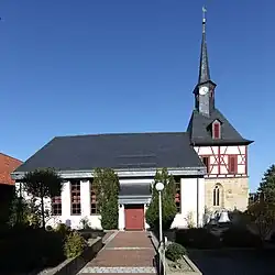 Das alte Langhaus war ein einfach gestalteter Fachwerkbau, 15,8 Meter lang und 8,2 Meter breit, mit zweigeschossigen Emporen und verputzter Flachdecke.[5] Das neue, breitere Langhaus hat ein verschiefertes Satteldach und eine verschalte Dachuntersicht aus Holz. Eine eingeschossige Empore ist an der Süd- und Westseite vorhanden.