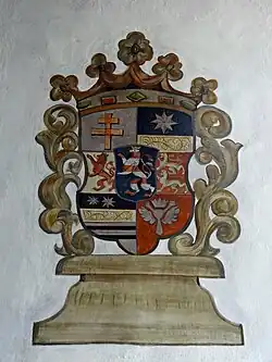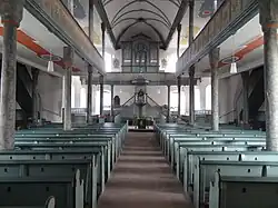 Der Innenraum über den Emporen wird von einer stuckierten Flachdecke abgeschlossen, die in den Ecken mit Putten verziert ist. Stucklisten an der Holztonne über dem Mittelraum imitieren ein Kreuzrippengewölbe.[16] Die Rippen enden in Medaillons, die wie Schlusssteine erscheinen und mit Früchten und Blättern verziert sind. Die Kreuzarme sind durch die Emporen abgetrennt und dienen als Treppenanlagen für die Emporen. Die dreiseitig umlaufende, U-förmige Empore ruht an den Langseiten auf toskanischen Säulen mit hohen, viereckigen Schäften und quaderförmigen Kapitellen. Oberhalb der Empore werden die Säulen zum Abstützen der Decke fortgeführt. Die Brüstungen sind mit Festons bemalt, die Bärenklau-Ranken zeigen. Die gräflichen Wappen von Wilhelm Moritz und seiner Frau Prinzessin Magdalene Sophie von Hessen-Homburg sind an der Ostwand der Kirche aufgemalt und flankieren die Orgel. Über der Empore an der Westwand sind der Bibelvers aus Ps 26,8 und die Inschrift „Erbaut im Jahre des Herrn 1703“ gemalt.[22]