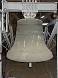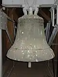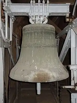 Der Kirchturm von 1710 beherbergt ein Dreiergeläut, für das Dilman Schmid und Philipp Schweitzer im selben Jahr eine große und eine kleine Glocke gossen. Die älteste nachweisbare Glocke aus dem Jahr 1629 eines unbekannten Glockengießers soll 700 kg gewogen haben und wurde aus dem Vorgängerturm übernommen.[14] Für die große Glocke, die 993 kg wiegt und einen Durchmesser von 1,18 Meter hat, wurde 1742 das Joch erneuert. Die mittlere zersprang 1886 und wurde durch die Glockengießerei in Apolda ersetzt (615 kg). Im Jahr 1917 wurde sie zu Rüstungszwecken abgeliefert und eingeschmolzen. Eine neue Rincker-Glocke von 1922 wurde 1942 beschlagnahmt und ging verloren. Rincker goss 1949 eine neue Glocke, mithin die vierte mittlere Glocke. Die große musste 1942 ebenfalls abgeliefert werden, kehrte 1947 jedoch aus Hamburg zurück.[28] Das Geläut erklingt im Gloria-Motiv.