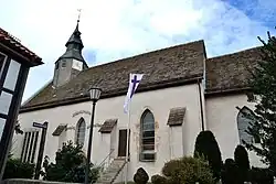 Die Saalkirche mit zwei Jochen aus verputzten Bruchsteinen wurde im Kern im 13. Jahrhundert erbaut und nach einem Brand 1307 erneuert. An ihr Langhaus, deren Strebepfeiler später angebaut wurden, schließt sich im Osten ein eingezogener, gerade geschlossener Chor an. Aus dem Satteldach des Langhauses erhebt sich im Westen ein achteckiger, schiefergedeckter, mit einem gestuften Helm bedeckter Dachreiter, der die Turmuhr und den Glockenstuhl mit einer 1624 gegossenen Kirchenglocke beherbergt.