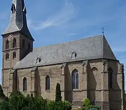 Der vorgesetzte spätromanische Westturm, der durch Lisenen und Rundbogenfriese gegliedert ist, sowie das zweijochige einschiffige Langhaus entstammen der zweiten Hälfte des 12. Jahrhunderts. Bei den Wiederherstellungsarbeiten des 16. Jahrhunderts wurde das Langhaus mit Strebepfeilern verstärkt und innen über romanischen Wandvorlagen ein Kreuzrippengewölbe eingezogen. Zu Anfang des 17. Jahrhunderts wurde der Turm um ein viertes Geschoss erhöht. 1956 wurden ein nördliches Seitenschiff und eine Sakristei angebaut.