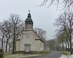 Die Kirche hat einen westlichen Dachturm mit welscher Haube und rechteckigem Grundriss. Zum Ostgiebel hat das Dach einen Krüppelwalm, an den Traufseiten je eine Fledermausgaube.