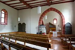Der Innenraum ist flachgedeckt. Die Balkendecke wird von zwei Längsunterzügen getragen. Ein spitzer Triumphbogen mit roter Quaderbemalung öffnet den Chor zum Langhaus. Den westlichen Abschluss bildet eine schmale Empore. Von ihrem spätgotischen Gestühl sind Reste erhalten. Der polygonale hölzerne Kanzelkorb des 18. Jahrhunderts ist am nördlichen Chorbogen aufgestellt. Er hat profilierte Kranzgesimse und hochrechteckige Füllungen, auf denen die vier Evangelisten dargestellt sind.