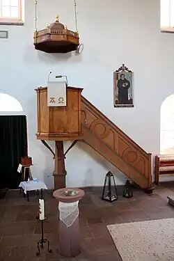 Die bauzeitliche holzsichtige Kanzel ist an der Südwand zwischen dem Eingang und dem westlichen Fenster auf einem viereckigen Fuß aufgestellt. Dem polygonalen Kanzelkorb entspricht der achtseitige Schalldeckel, dem an den Ecken kleine vergoldete Spitzen aufgesetzt sind. Rechts von der Kanzel ist ein Lutherbild aufgehängt, das ebenfalls von den Kaysers gemalt wurde.[8] Links vom Südportal ist ein Bibelvers an der Wand gemalt (1980/1981): „Christus spricht: Ich bin der Weg und die Wahrheit und das Leben; niemand kommt zum Vater denn durch mich. Joh. 14,6“.