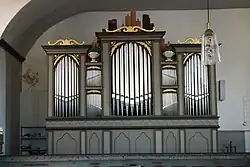 Im Jahr 1836 war die Kirche noch ohne Orgel.[18] Friedrich Wilhelm Weller aus Wetzlar, der 1858 die Tochter des damaligen Pfarrers Wieber geheiratet hatte, baute im Jahr 1859 eine Orgel. Das am 18. September 1859 eingeweihte Instrument verfügte über ein Manual und Pedal. Der flache Prospekt ist fünfachsig gegliedert. Je zwei Lisenen werden oben von einem profilierten Gesims abgeschlossen und bilden drei hochrechteckige Pfeifenfelder, von denen das mittlere überhöht ist. Dazwischen sind zwei niedrige doppelgeschossige Pfeifenfelder angebracht, die von Urnen bekrönt werden. Durch die Firma Eichhorn (Weilmünster) erfolgte 1934 eine Renovierung, bei der drei Register ausgetauscht wurden. Eine weitere Renovierung durch die Firma Walcker führte 1953 zum Austausch weiterer Register.[19] Vor 1999 wurden die Register Bourdon 16′ und Posaune 8′ ergänzt. Die Disposition umfasst seitdem 14 Register und lautet wie folgt:[20]