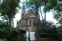 Man begann mit dem Bau eines massiven rechteckigen Gebäudes im neugotischen Stil aus hellem Backstein mit einem abgetreppten Giebel und Apsis.[3] Ein 30 Meter hoher Turm mit spitzem Dach wurde angefügt. Ein Satteldach deckte das Kirchenschiff, in dessen Seitenfassaden vier Buntglasfenster eingelassen wurden. Das Geläut der am 28. September 1871 eingeweihten Kirche bestand aus zwei Glocken.[3]