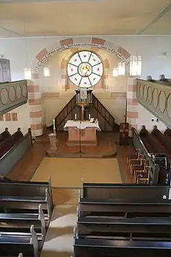 Der liturgische Bereich ist um eine Stufe erhöht und reicht noch in die Vierung hinein. Die polygonale Kanzel von 1742–1745,[11] deren Kanzelfelder durch gedrehte Freisäulen gegliedert werden, steht an der Westwand und hat einen zweiläufigen Zugang mit einer kassettierten Brüstung. Sie geht im Kern ebenfalls auf Müller zurück. Bis 1905 war sie mit Schalldeckel an der südlichen Langseite angebracht.[1] Vor dem Chorbogen sind der Blockaltar und das achtseitige Taufbecken aufgestellt, die beide aus rotem Sandstein gefertigt sind. Der Altar wird von einer überstehenden, schwarzen Mensaplatte bedeckt. Auf ihm ist ein holzsichtiges Altarkreuz mit der Tafelinschrift INRI und einem Kruzifix des Dreinageltypus aufgestellt. Die Orgel steht unter dem alten Ostbogen, der Turm und Schiff verbindet. Das Kirchengestühl mit geschwungenen Wangen bildet in den beiden Flügeln des Querschiffes je einen Block und lässt im Schiff einen Mittelgang frei.